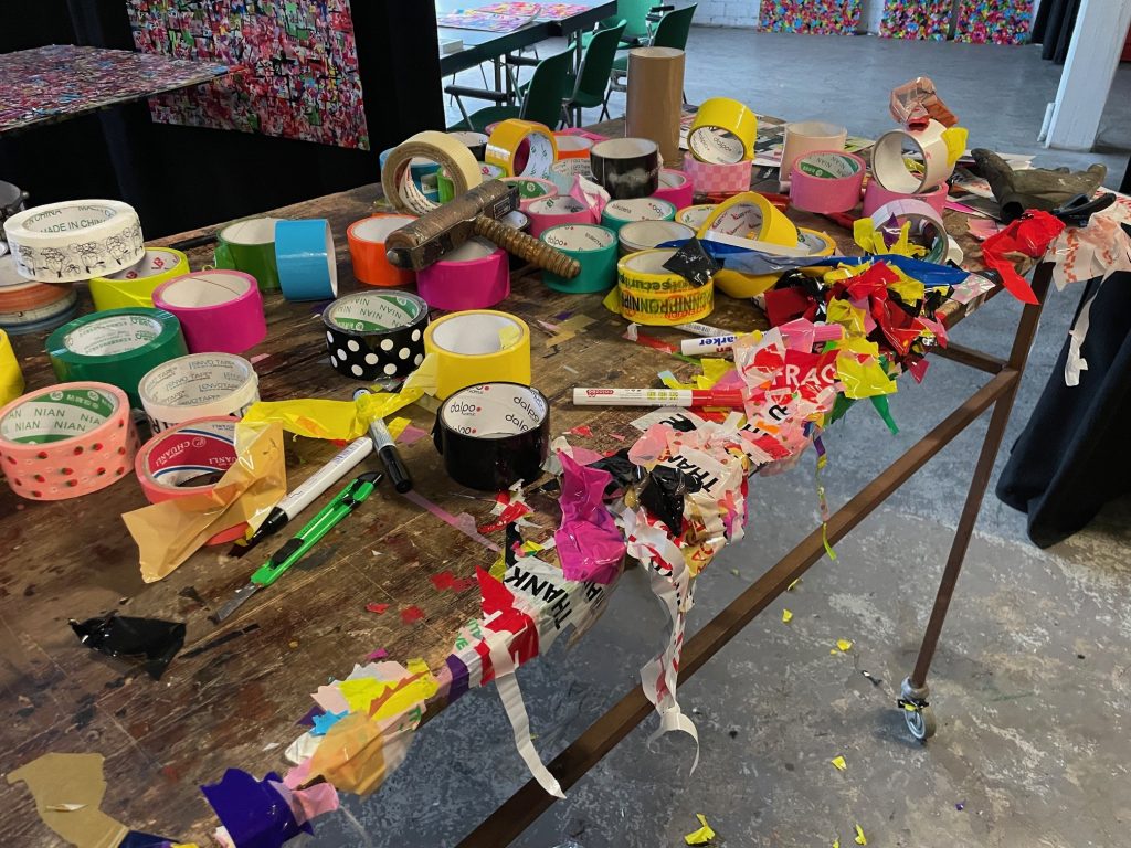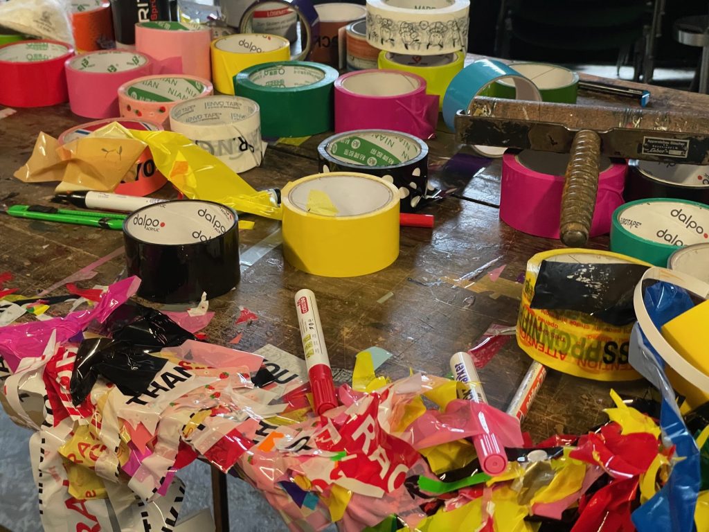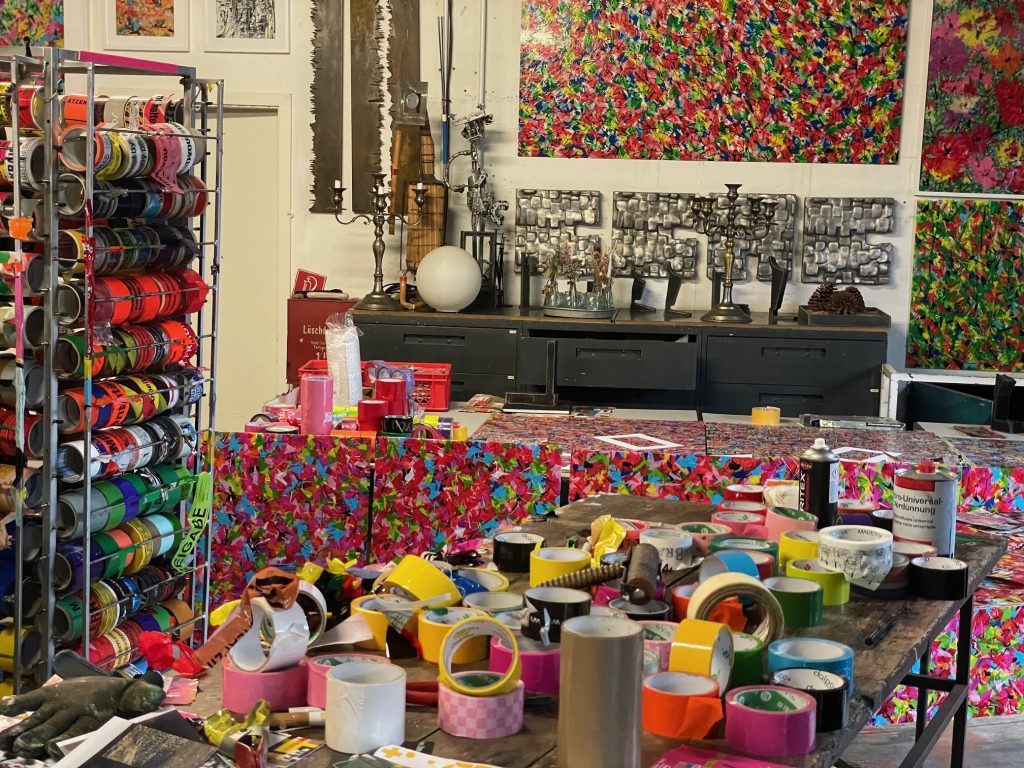 Meine Tape Art Arbeiten bestehen alle aus Klebebändern, von denen ich mittlerweile über 1.000 Rollen aus den unterschiedlichsten Kontinenten und Länder habe. Durch die hohe Anzahl an Rollen besitze ich eine breite Palette an Rollen, die in ihrer Farblichkeit alle eine Vielzahl an unterschiedlichen Farbtönen abdecken. Aber ich sammle immer weiter, denn Materialität, Materialstärke und Farblichkeit unterscheiden sich immer, je nach Herkunft und Produktionsverfahren.